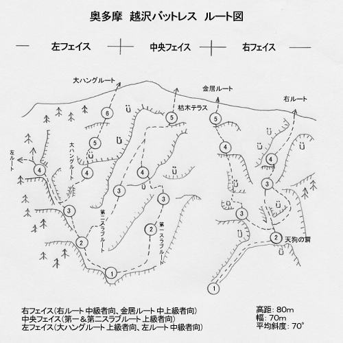 岸壁の60m付近に一連のオーバーハング帯があり、ほとんどがスラブで形成されている。フェースクライミング、人工登攀と変化に富んだルートがとれ、岩登り技術の全てを要求される、中級者・上級者向けのゲレンデである。