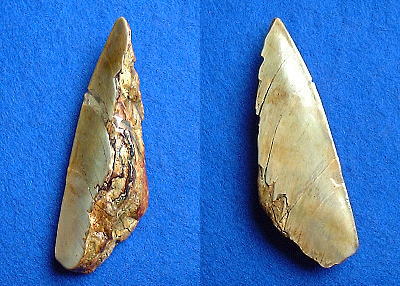 No.:H01 種 類:ホオジロザメの歯 (学名:カルカロドン・カルカリアス) 年 代:新第三紀鮮新世(520万年前) 採集地:千葉県銚子市長崎町(名洗層) 採集日:2000年5月5日 サイズ:高さ32mm、最大幅28mm |