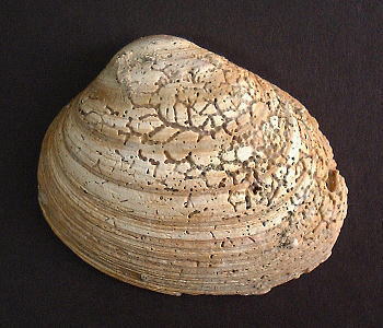 | 特徴 | 殻は楕円形で厚く重い 下のサンプルは穿孔性海綿のクリオ−ナ(Cliona)の 穿孔活動により、貝殻の石灰層が溶かされています。 |