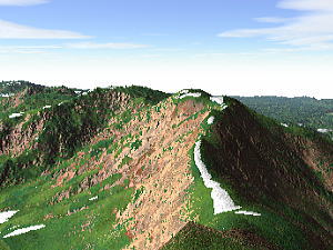 | 備考) カシミール3D(カシバード)では、冬景色のコントラストがうまく表現出なかったので、夏のイメージで計算しています。 なお、この計算には国土地理院発行の数値地図50mメッシュ(標高)を使用しています。 |