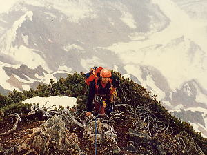さて、雪面の急登も終わり、第一尾根基部に到着した。登攀具を装着し、僕らはガリーをたどる商大ルートを登ることにした。そして、僕がトップで登り始める。当時の登攀中の写真があまり無いのは残念だが、多分、そんな心の余裕は無かったのだろうと思う。取付から3ピッチで、赤褐色のアンサウンド・バンドに到着する。ここより左へトラバースし、主稜上の大テラスに出る。ここからの第四尾根の眺めはなかなか良かった。第四尾根に取り付いているパーティーの様子がつぶさにわかるのだ。小休止後、登攀を再開するが、この頃より小雪が舞い始める。左右が切れ落ちた主稜上のナイフリッジを慎重に登り、オーバーハングの下のギャップに出る。このオーバーハングを乗り越し、さらにハイ松のリッジを登って、登攀終了点に到着した。大テラスから確か3ピッチだったと思う。その後、ハイ松帯を登り、北岳山頂に到着する。