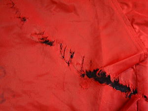 この講習会で、僕のヤッケはザイルの摩擦で見事に焼けただれてしまったのである(左の写真)。今でも、この時のヤッケの焼け焦げた跡を見るたびに、当時の講習会を思い出すのである。 |