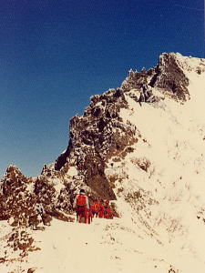 3日連休を利用して、6名で八ヶ岳に行った。一人は1日遅れて入山する。 初日は、茅野よりタクシーにて美濃戸口まで入り、ここから4時間半の所要で行者小屋に到着する。午後は時間があったので、付近の沢で雪上訓練を行うが、風雪ひどく15時に切り上げてBCに戻った。 入山2日目は5時起床、同行の女性1名が体調不良の為、テントキーパーに残し、男性4名で赤岳に向かう。僕と先輩の2名は赤岳西壁・主稜を登攀し、他の2名はノーマルルートより登り、10時30分に赤岳山頂で合流する。 その後、横岳、硫黄岳へと縦走し、赤岳鉱泉経由で、14時30分にBCに到着した。この日、他の1名が入山し、BCで合流する。 3日目は、6名にてBCを6時に出発、ノーマルルートより阿弥陀岳に登る。7時30分に頂上に到着し、展望を楽しんだ後、8時30分にはBCに戻る。その後、BC撤収後、美濃戸口から新宿直行バスで帰路についた。この山行は幸いにも好天に恵まれて、なかなか良い3日連休を過ごすことができたのであった。 編集後記 手元の記録をひっくり返してみると、僕はこの山行より会のリーダーをやっていたようだ。それまではサブリーダーとして、山行では常にトップを歩いていたが、リーダは最後尾を歩くのが慣わしだった。理由はメンバー全員の体調や様子を常に観察し、適時に休憩をとる必要があるからだ。やってみるとわかるが、純粋に景色ばかりに見とれている訳にもいかないので、意外と気疲れするのである。 それともう一つ大事な役目があった。それは最後尾から皆の歩く姿を撮影することであった。たかが写真と思っていたが、いざやってみると、重い荷物を背負っての撮影は結構大変で、ズボラな僕はあまり写真をとらなかった。だから、メンバーからは不評だったかもしれない。この時、僕は24才であった。 |
