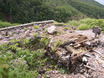 さらに少し進むと、旧硫黄採集地がある。かつては、ここに人が寝泊まりし、硫黄を採集していた跡だ。すっかりその面影はなくなっているが、石垣だけはしっかりと残っていた。 |