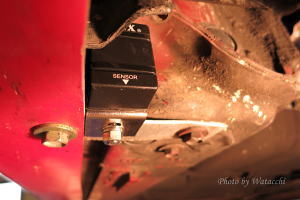 後輪を外し、タイヤハウスを外し、サイドステップ後方より、センサのリード線を入れ、サイドステップにコネクタが通る穴を開け、ここからドア下部を経由して、車内に引き込んだ。
