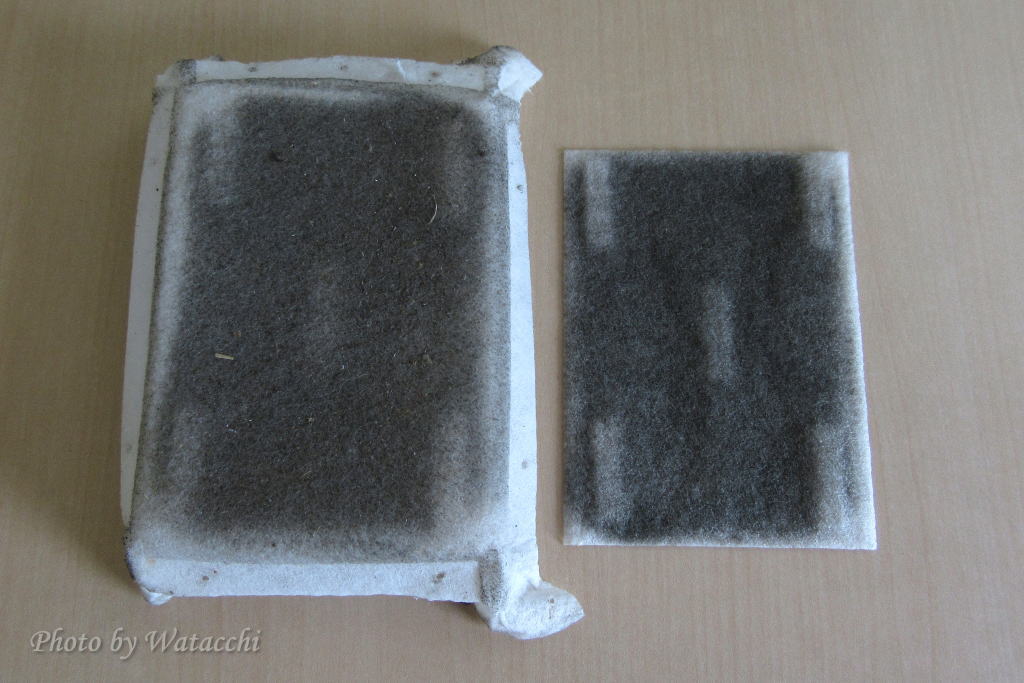 | 粘着剤付きのフィルタなので、一度付着したゴミは吸い付いてしまうので、フィルタ効果も大きいようだ。 |