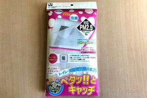交換するフィルタは、ホームセンターで換気扇用に売られていた右の写真のモノを購入し、取り付けることにした。粘着剤付き特殊フィルタで、0.1μmの捕集効率が75.5%の性能とのこと。