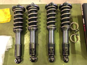 依頼から2ヶ月後、サスペンションキットが完成したとの連絡が入ったので、組込の為、5月13日、日帰りでショップに出向いた。10時に到着し、早速、Oさんに作業を開始してもらった。このサスペンションユニットは、車高調整式なので、タイヤ上部とボディの間に指が1本入る程度の車高に設定してもらうことにした。