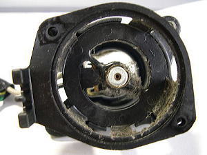 ゲ〜! ホコリがビッシリとセンサー本体にこびり付いています。さらに、ユニットのネジx2本を外すと、ユニットを2つに分解できます。ファンとモーターにもホコリがビッシリと付いています。(写真4&5) 綿棒でこのホコリを丹念に取り除きます。その後、アルコールで綺麗に清掃します。最後に、ファンモーターの軸にスプレー式グリスを塗ります。これで大丈夫でしょう。ユニットを元通りに組み立てます。ファンを取り付ける際、ファンの軸が動きますので、適切なポジションになっていないとファンが廻らない場合がありますので注意が必要です。組み立て後、念のため、息を吹きかけてみて、ファンがスムーズにまわることを確認します。