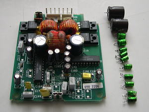 左の基板がサブウーハー&センタースピーカ用アンプです。電解コンデンサが12ヶ取り付けられていますので、このコンデンサすべてを新品に交換します。この基板は両面に回路パターンがあるので(いわゆる両面基板)、電子部品の組み立てをやったことがない方は、少し難しいかもしれません。半田ごて、半田、半田吸取機などが必要になります。