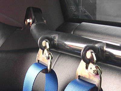 | フルバケットシート取付のついでに、4点式シートベルトが装着できるように、リアハーネスバーを取り付けました。バーは「KSP Engineering」製で、メッキ無し、黒メッキ有りの2種類がありましたが、あまり目立たないように黒メッキされたものにしました。このバーはルームミラーに映る後ろの景色にバーが映り込まないように、バーの形状が工夫されています。取り付けは純正シートベルトの支点を使いますので、内装を少々カットすることになります。元に戻すにはカット部分の内装を購入する必要がありますが、数千円程度のようなので、特に大きな問題はありません。 このバーを利用してビデオカメラも取り付けられますので、それなりに重宝します。ちなみに、洗濯物も干そうと思えば吊せますよ(爆)。