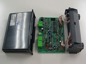 20分ほどでエアコン・ユニットを取り外すことができた。左右のネジ2本と後のネジ1本を外すと、カバーが前後に分離し、制御基板が見えてくる。手前のプラスチック・ガイドを外すと中の基板を引き出すことができる。 |