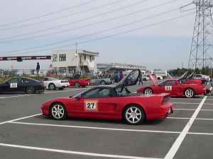 自宅を6時45分に出発、途中、通勤ラッシュに巻き込まれたこともあり、8時45分に現地着。既にブリーフィングが行われていた。受付を済ませ、ゼッケン(27番)を受け取り、走行の準備をする。走行開始は9時だ。今日の走行は4クラスとのことで、僕はNSXだけで編成されたBクラスとなる。Bクラスの第1ヒートは9時15分〜30分迄の15分間だ。 |