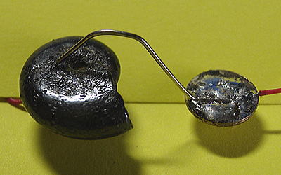 アンモナイトの化石を使って、鉱石ラジオを作ってみました。使ったのは、直径1cmほどのモロッコ産の赤鉄鉱化したジュラ紀のアンモナイトです。これは鉱物フェアに行った時に買っておいたものです。様子は下の写真を見て下さい。何故、アンモナイトの化石を検波器に使ったかですが、アンモナイトの化石が赤鉄鉱に置換していれば、これは鉱石の一つで半導体ですので、検波器として充分動作するはずだと考えたからです。